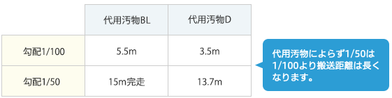 配管勾配は1/100よりも1/50をおすすめします。⇒ 汚物は勾配によって搬送されていきます。以下の実験結果を参照下さい。